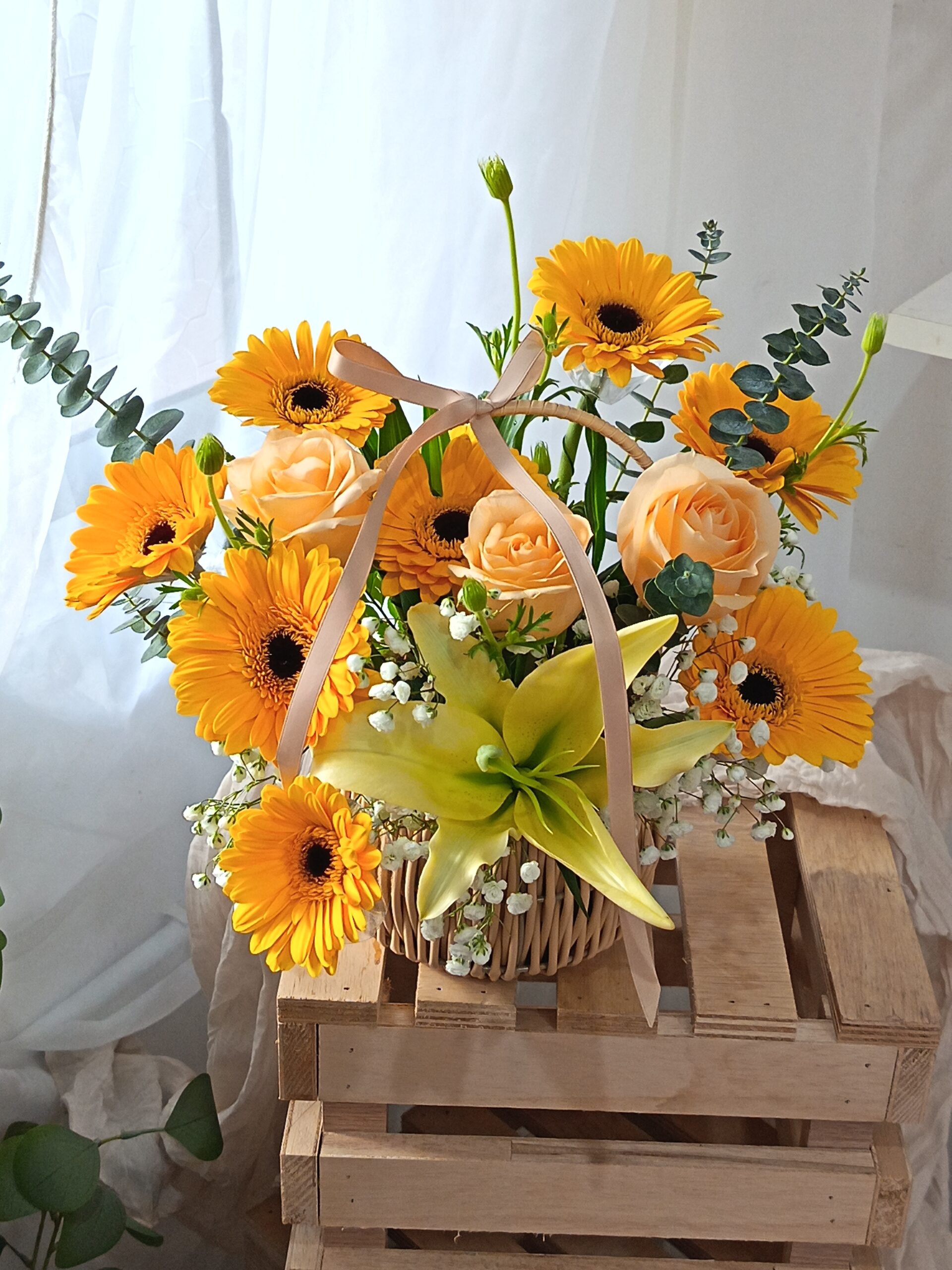 Petite flower basket for your love ones this Valentine’s day! Flower basket consist of 6 yellow daisy, 3 champagne rose and a yellow lily!
